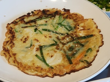 위에 부추랑 깨가 듬뿍 올라가 있어서