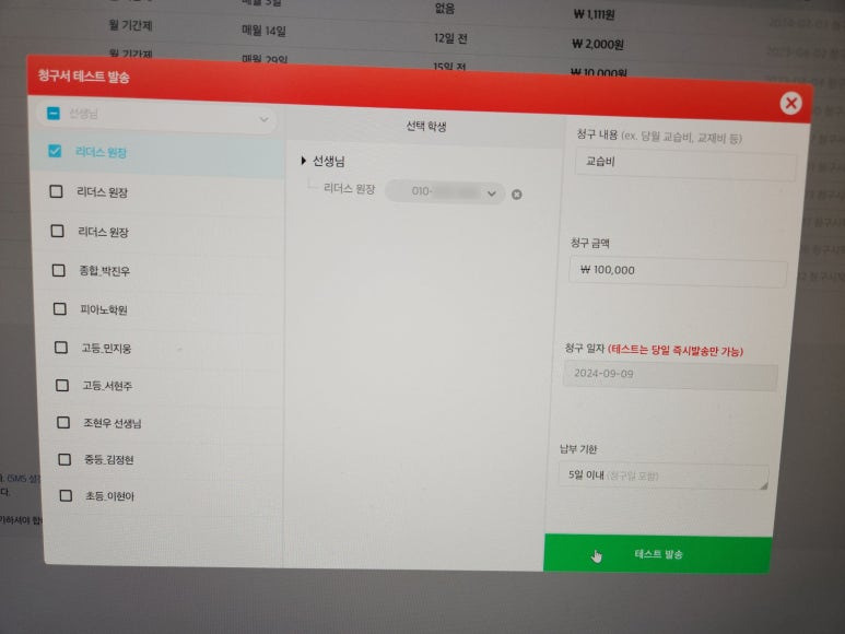 학부모님에게 청구서 발송하는 것도 가능해요.
