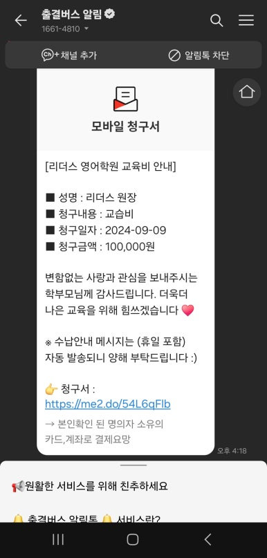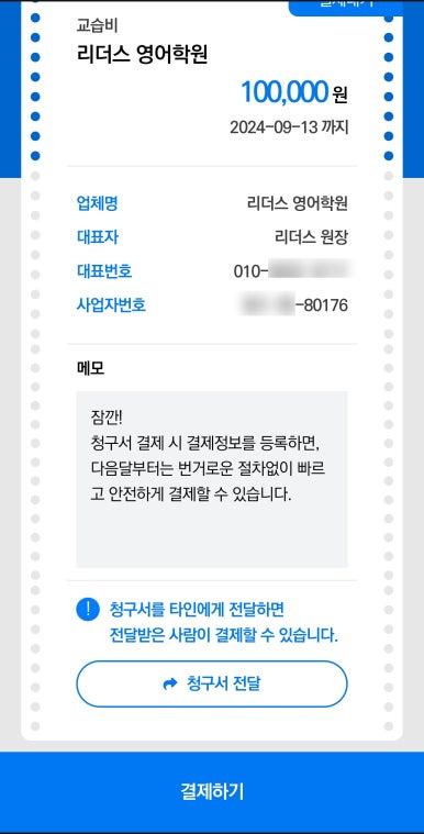 메시지로 학원비 비대면 결제가 가능합니다.