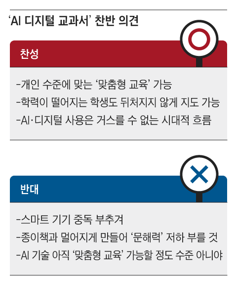 조선에듀에서는 “도입이 코앞인데… 찬반논란 불거진 'AI 디지털교과서'”라는 제목으로 관련 기사를 다루었으며 (조선에듀), 어나더씽킹랩에서도 “AI 디지털 교과서 도입, 찬성 vs 반대?”라는 주제로 심층 토론을 진행했습니다 (어나더씽킹랩).
