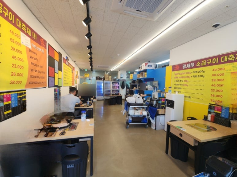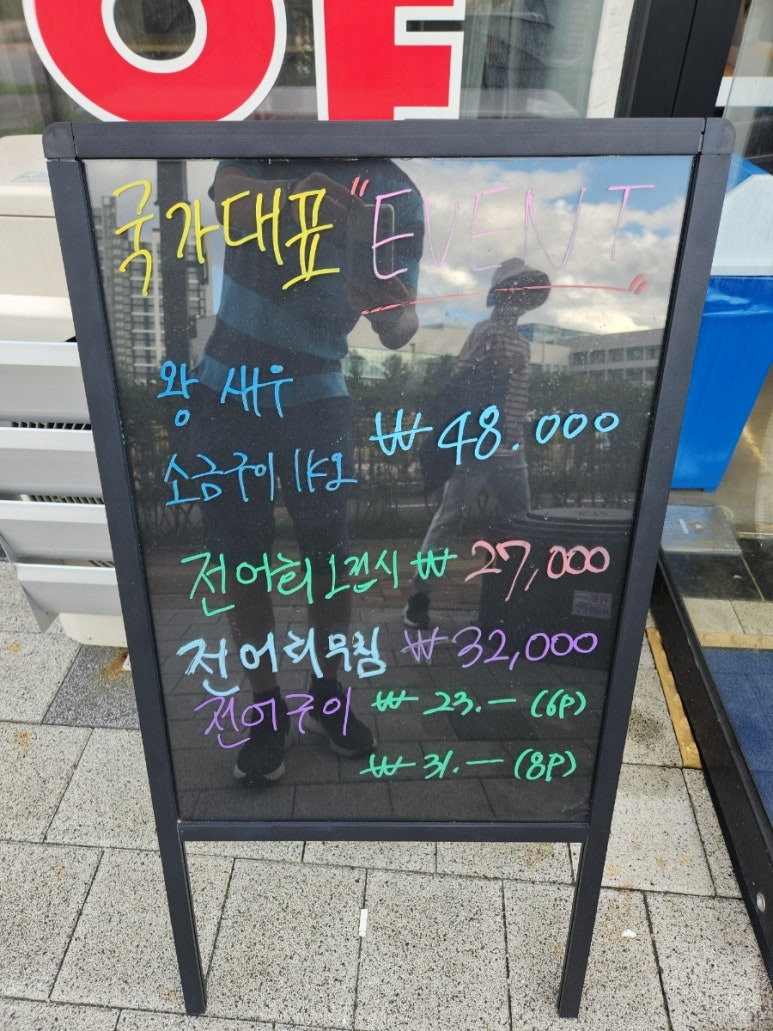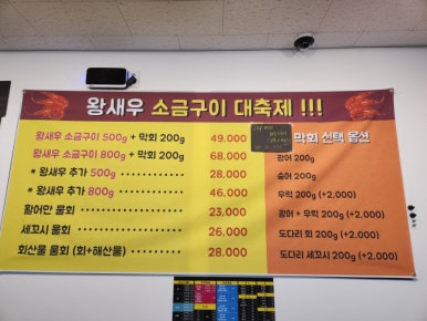 왕새우 소금구이랑, 전어회가 할인 중이었어요.