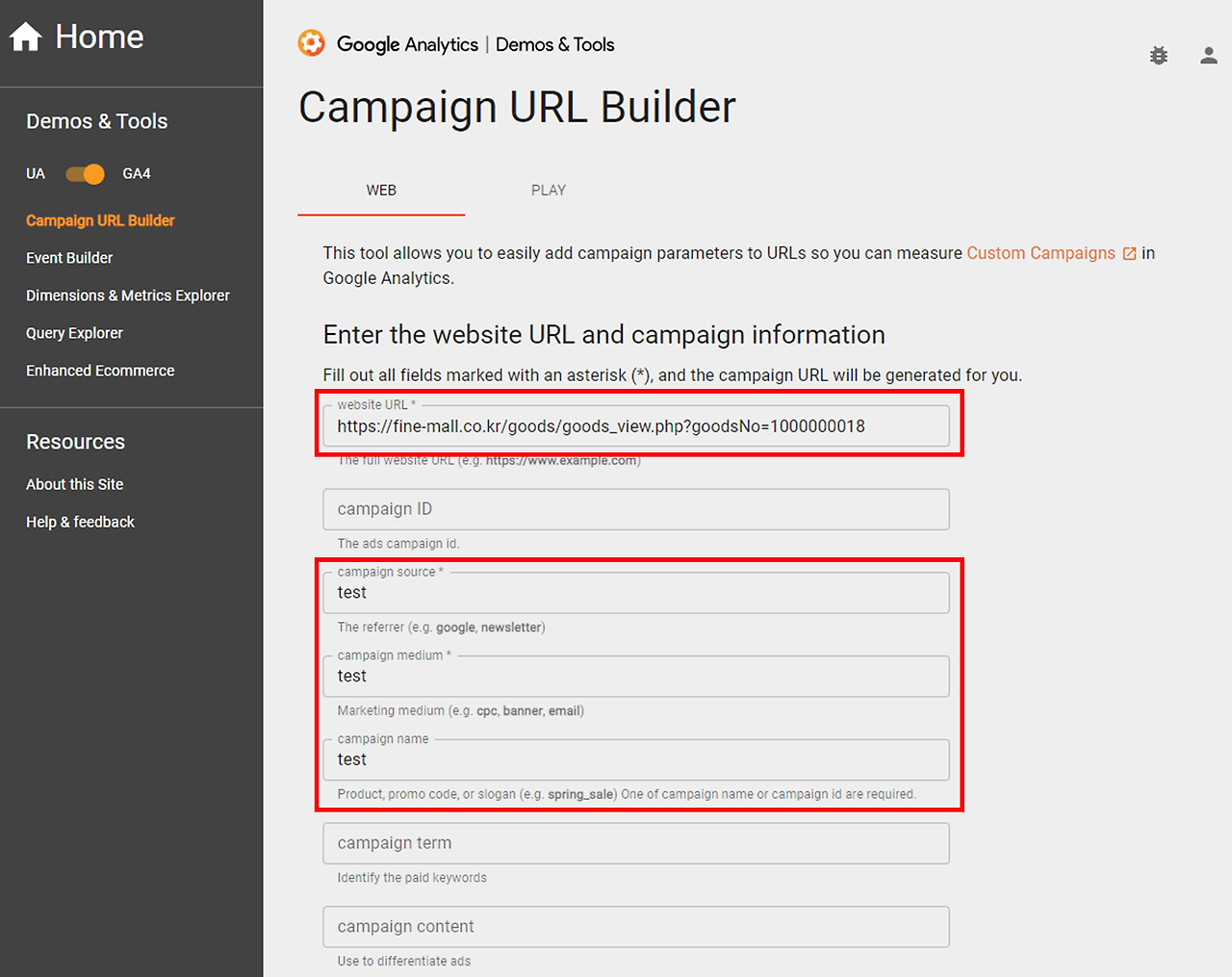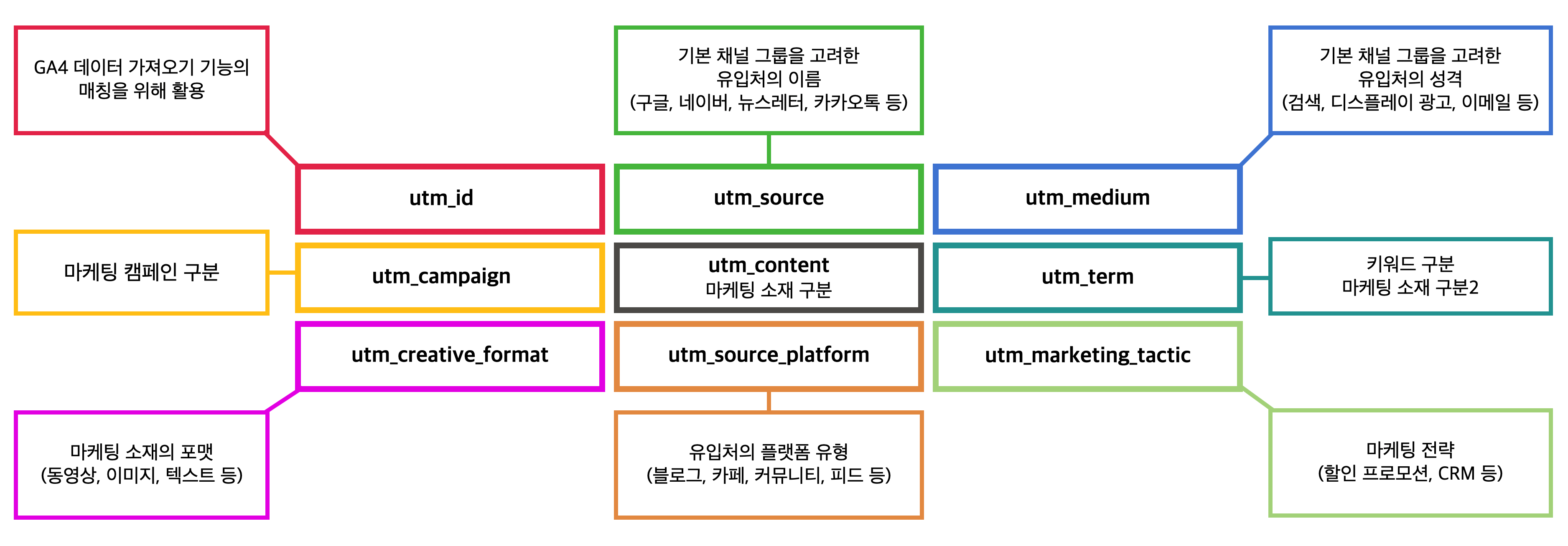 - utm_term : 유료 검색 광고에서 키워드를 추적하기 위해 사용해요. 예를 들어, 'running+shoes'와 같은 키워드를 사용할 수 있어요.