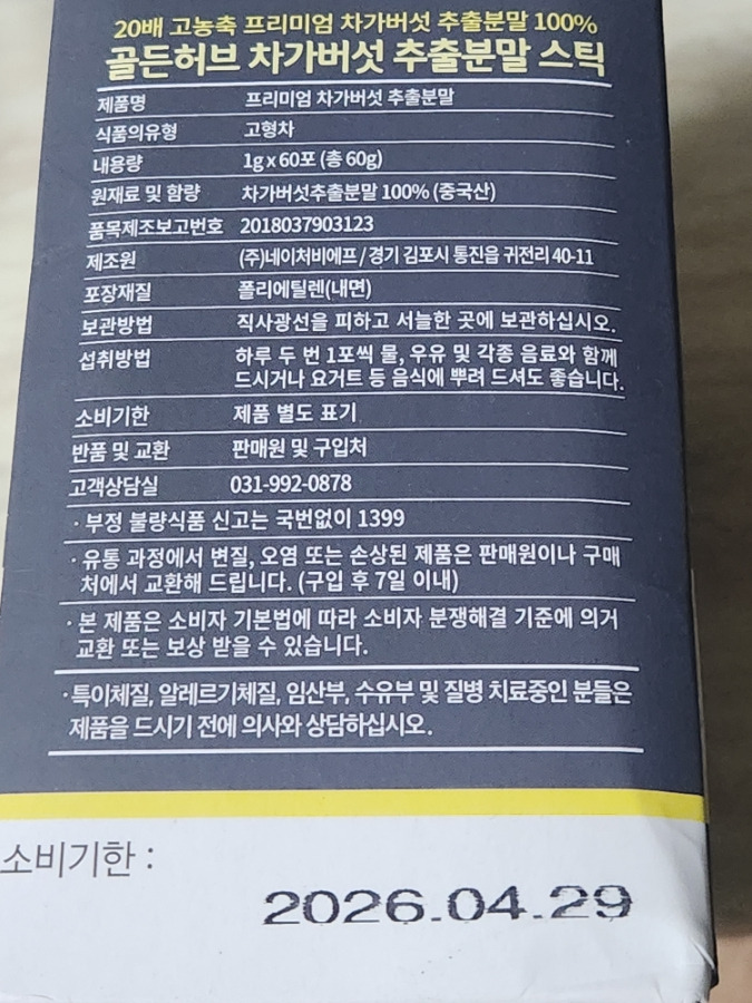 20배 고농축의 차가버섯 추출분말 100%에요.