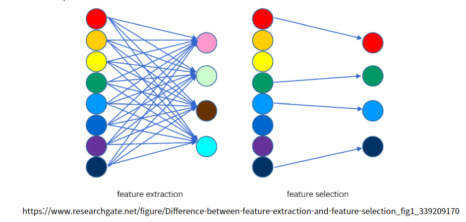위 이미지에서 보듯이, 변수 선택은 특정 변수만을 강조하는 반면, 변수 추출은 새로운 변수를 만들어내는 과정을 보여줍니다.