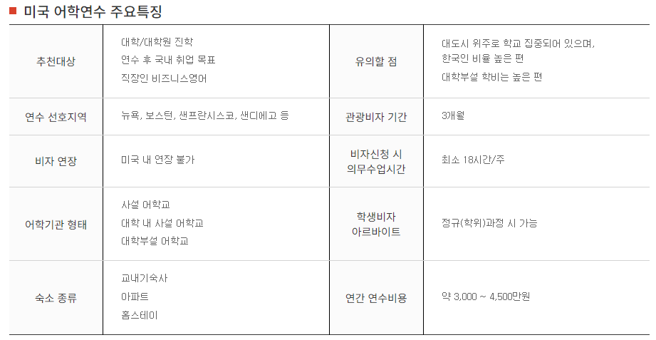 각 어학연수 장단점을 비교할 수 있어요.