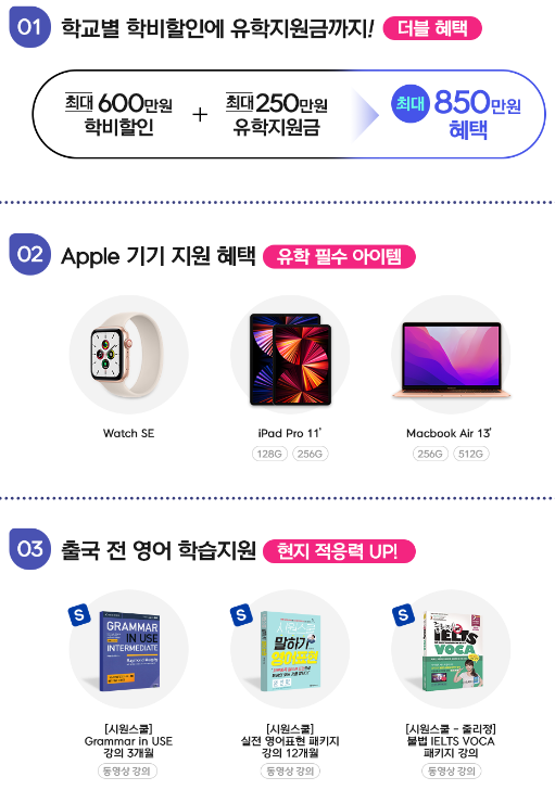 학교별 학비, 학교별 학비할인, 유학지원금,