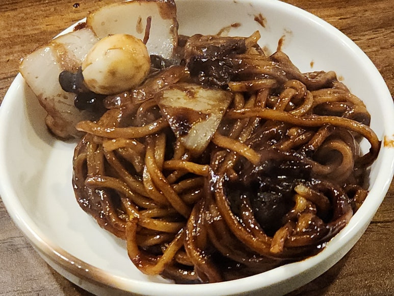 뜨거운 돌판 위에 짜장면이 올라가 있구요.