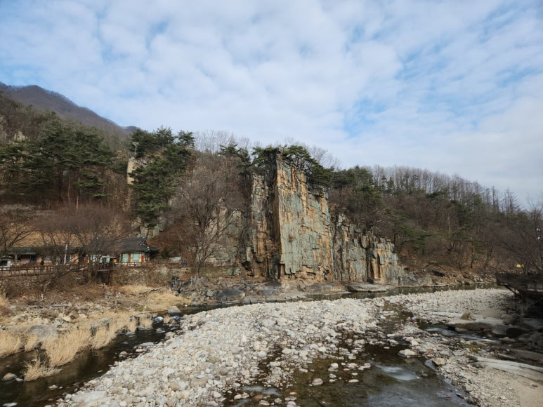 사인암과 산이 보여요.