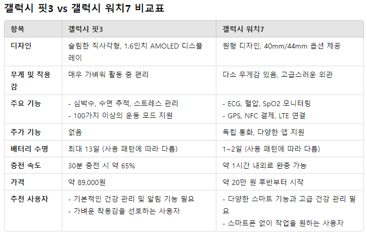 갤럭시핏3와 갤럭시워치 비교표입니다.