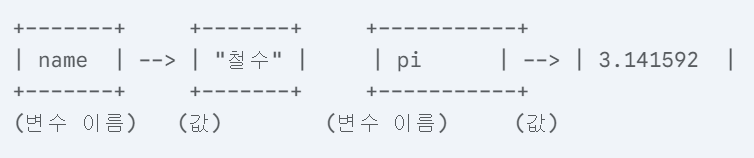위 그림에서 name이라는 이름의 컵에는 "철수"라는 문자열이 들어 있고, pi라는 이름의 컵에는 3.141592라는 실수가 들어 있습니다.