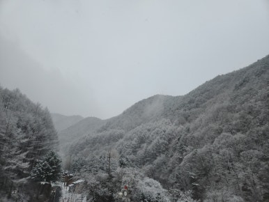 눈으로 뒤덮힌 산이 너무 멋지네요.