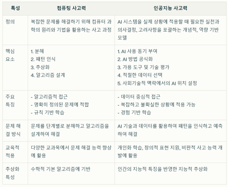 - 학습 방식 : 컴퓨팅 사고력은 규칙 기반 학습을, 인공지능 사고력은 경험 기반 학습을 중시합니다.