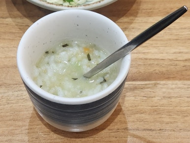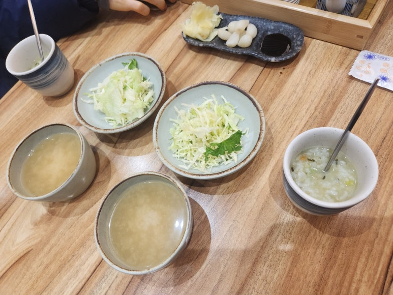장국, 죽, 샐러드가 나왔어요.