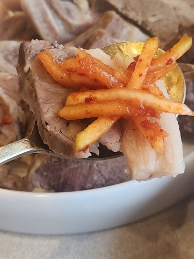 부들부들 수육에 김치 올려서 먹으면 아주 꿀맛이에요.