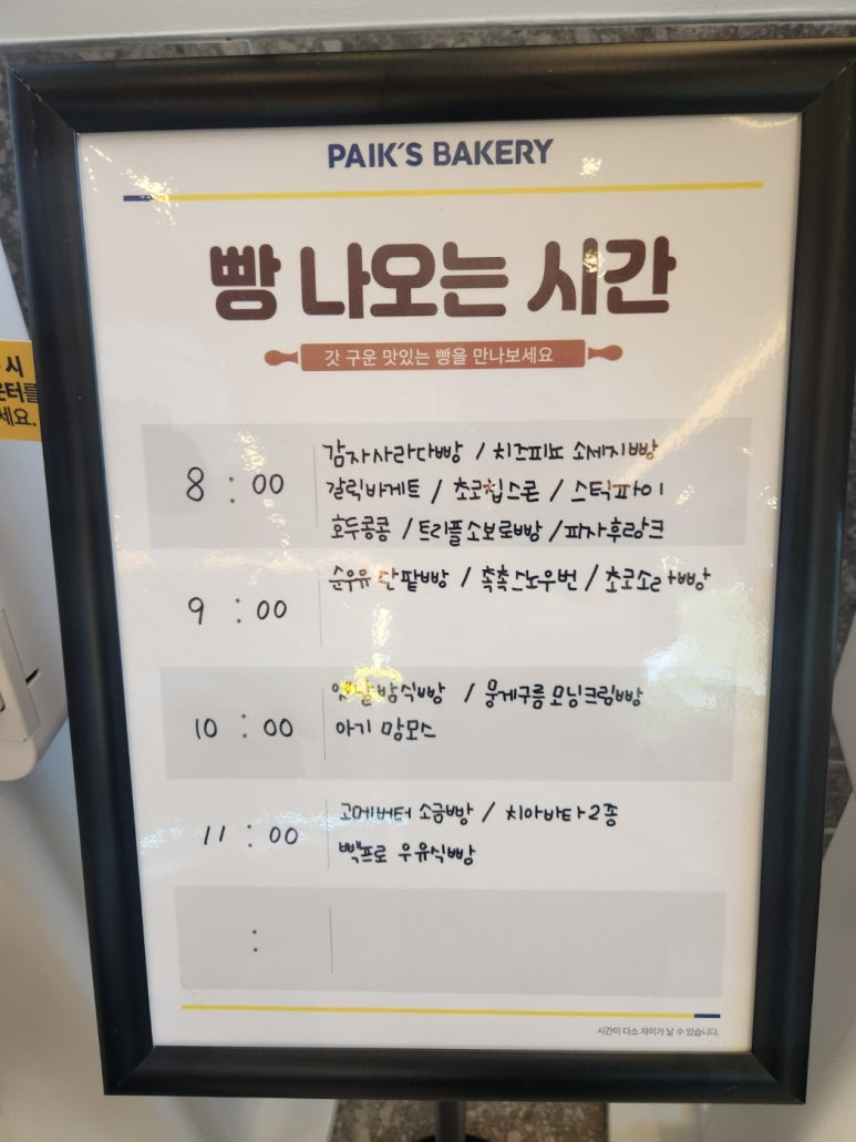 빵 나오는 시간은 1시간 단위로 나뉘어 있어요. 타이밍 맞춰가면 더 다양한 종류 맛볼 수 있을 듯!