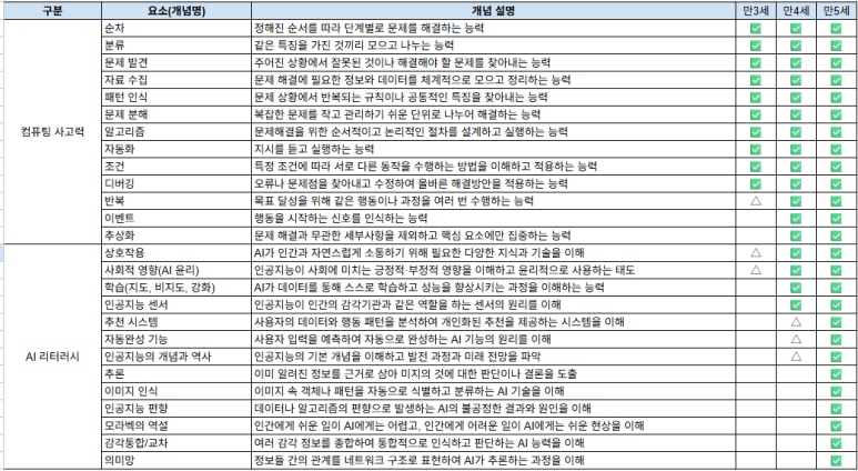 아래는 만 3세부터 만 5세까지 유아들이 배울 수 있는 컴퓨팅 사고력 및