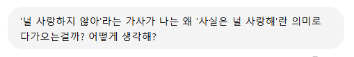 - “널 사랑하지 않아”라는 말이 너무 여러 번 반복되죠. 진심이라면 그렇게까지 말할 필요가 없을 수도 있어요.