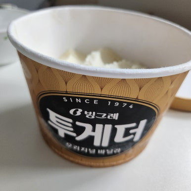 - 집에 있는 투게더 바닐라 아이스크림 한 스쿱.