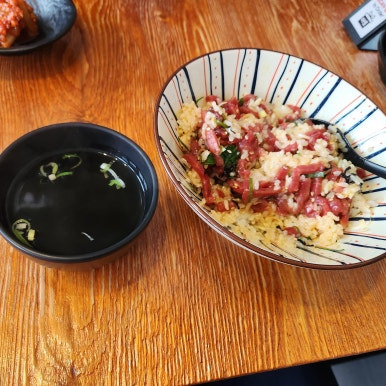 덮밥 위에 듬뿍 얹어진 육회는 신선하고 부드러워서 입안에서 사르르 녹았어요.