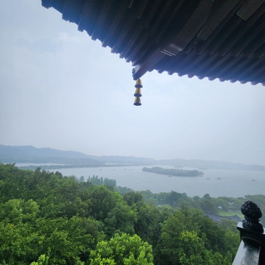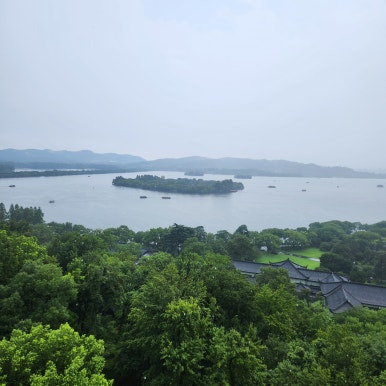 뇌봉탑 꼭대기에서 바라본 서호의 풍경은 정말 인상적이었어요.