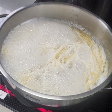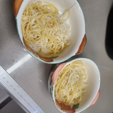 - 냉장고에 있던 소면을 삶고, 차가운 물에 헹궈 준비!