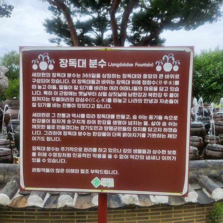 - 수백 개 장독대 사이 물줄기가 피어오르는 모습이 세미원 시그니처 뷰예요.