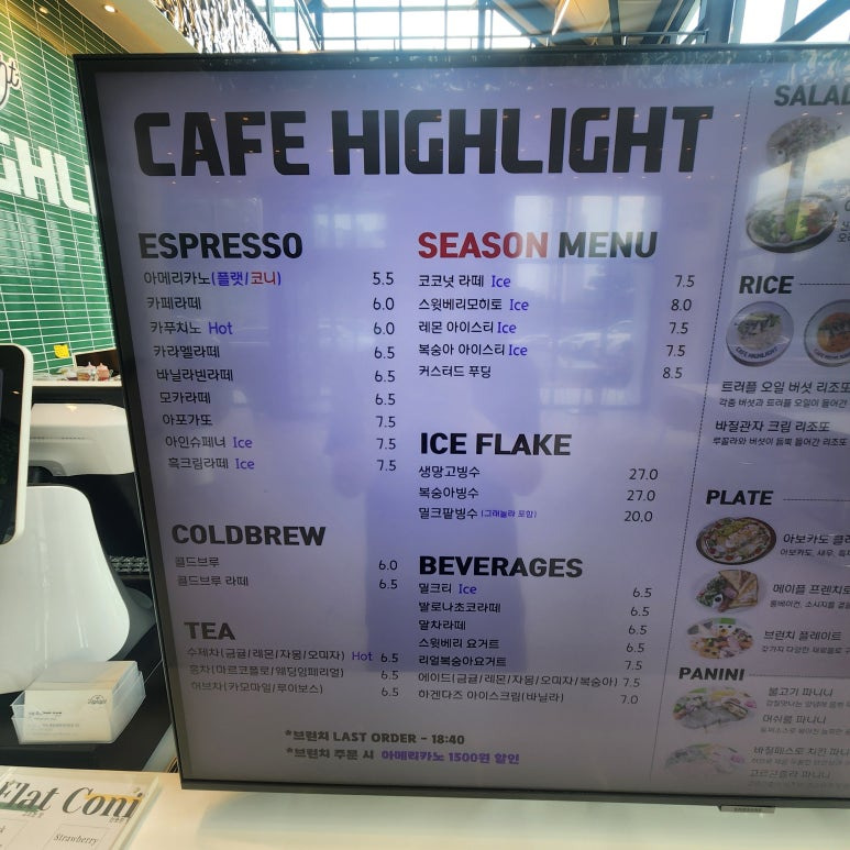 - 아메리카노: 5,500원 (원두 선택 가능 – ‘플랫(고소한 맛)’, ‘코니(산뜻한 맛)’)