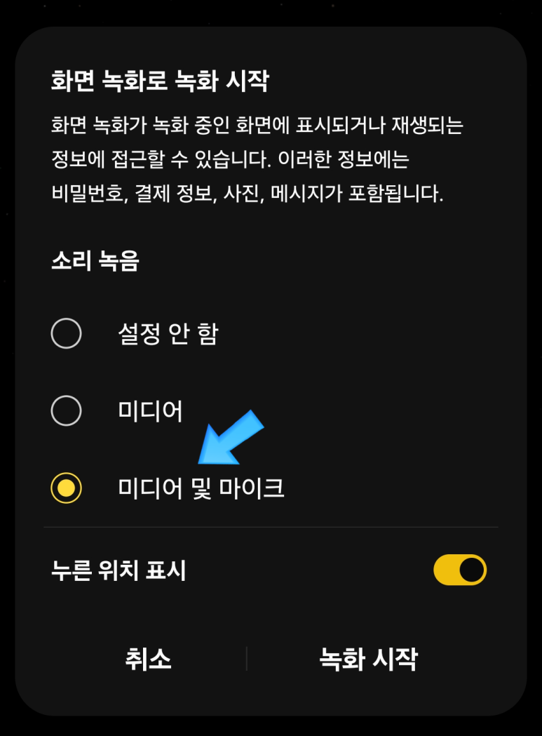 - 소리 녹음 옵션에서 “미디어 및 마이크”를 꼭 선택해야 해요.
