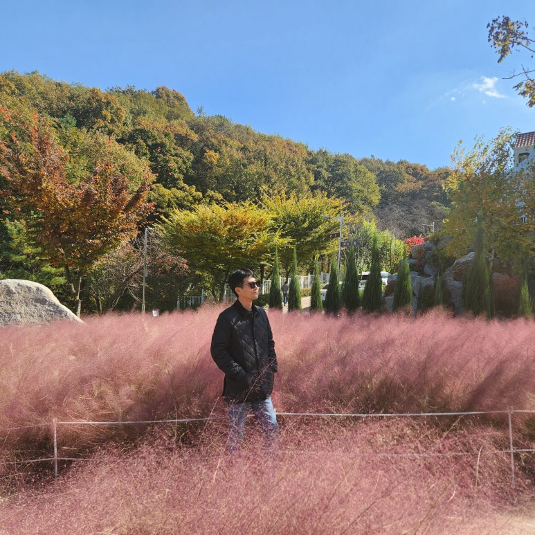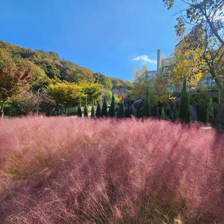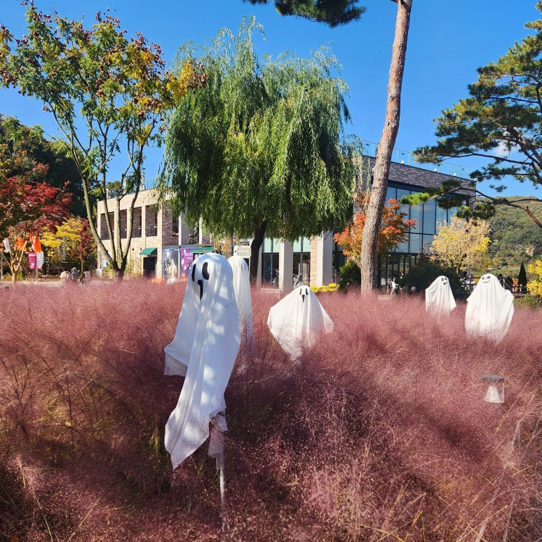 곳곳에 할로윈 장식이 되어 있는데, 핑크뮬리와 어울리지 않는다.