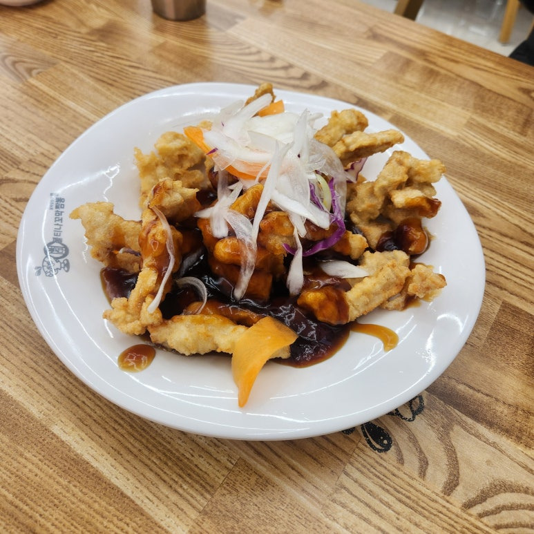 바삭한 튀김에 달달한 소스가 스며들어, 얼큰한 짬뽕 국물과 찰떡궁합이었어요.