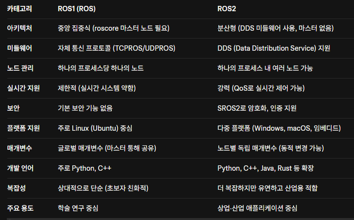 ROS1은 여전히 많은 레거시 프로젝트에서 사용되지만, 미래 지향적이라면 ROS2로 전환하는 게 좋겠어요. ROS2는 더 안정적이고 확장 가능하며, Open Robotics의 공식 지원도 ROS2에 집중되고 있어요. 만약 ROS1에서 ROS2로 마이그레이션 중이라면, 공식 문서나 튜토리얼을 참고하세요! 여러분의 로봇 개발 여정에 도움이 되길 바래요. 댓글로 질문 남겨주세요~ 🚀
