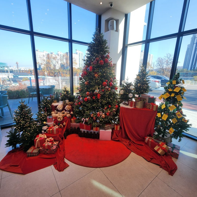카페에 들어서니 11월인데도 크리스마스 장식이 반짝반짝, 분위기가 로맨틱하네요. 복층 구조로 되어 있어서 1층은 밝고 개방감 있고, 2층은 계단과 난간이 있어서 케어키즈존으로 운영 중이에요.