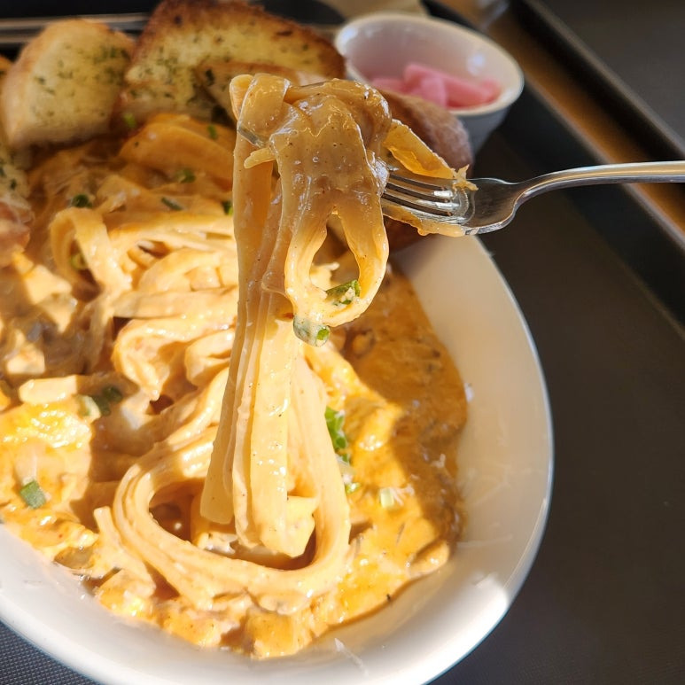 투움바 파스타는 꾸덕꾸덕한 크림 베이스에 살짝 매콤한 맛이 더해져서 느끼함 없이 맛있었어요. 면이 칼국수처럼 넓고 쫄깃한 게 특징이고, 마늘빵도 함께 나와서 든든했답니다.