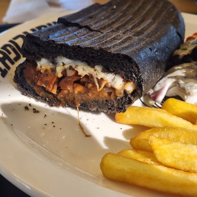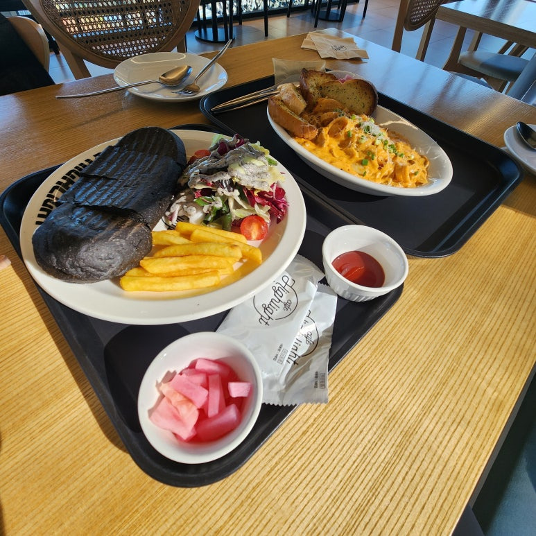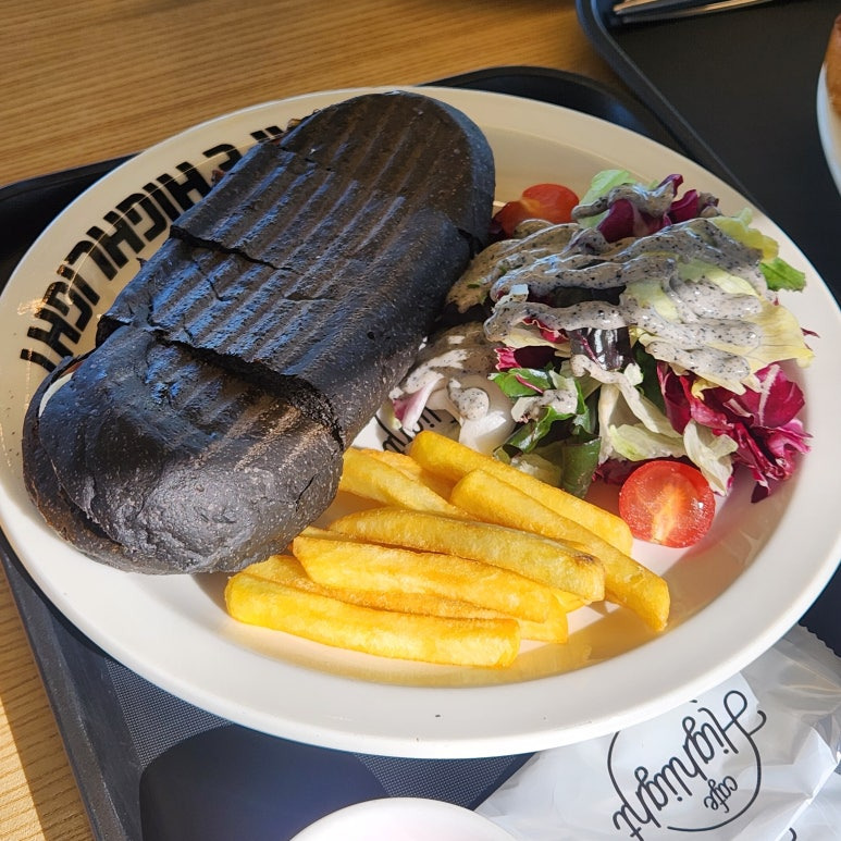 파니니는 이탈리아식 샌드위치로, 빵 색깔이 검은색인데 (먹물이 들어간 듯해요) 겉이 바삭바삭하고 안에는 치즈와 버섯이 듬뿍! 샐러드와 감자튀김이 사이드로 나와서 구성도 만족스러웠어요. 아메리카노나 디카페인과 함께 먹으니 딱이었죠.