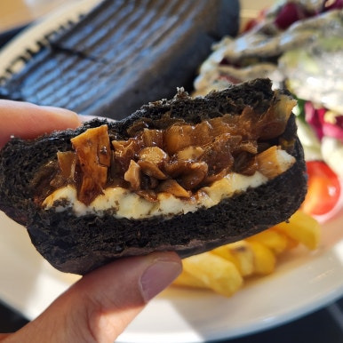 파니니는 이탈리아식 샌드위치로, 빵 색깔이 검은색인데 (먹물이 들어간 듯해요) 겉이 바삭바삭하고 안에는 치즈와 버섯이 듬뿍! 샐러드와 감자튀김이 사이드로 나와서 구성도 만족스러웠어요. 아메리카노나 디카페인과 함께 먹으니 딱이었죠.