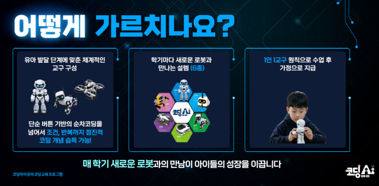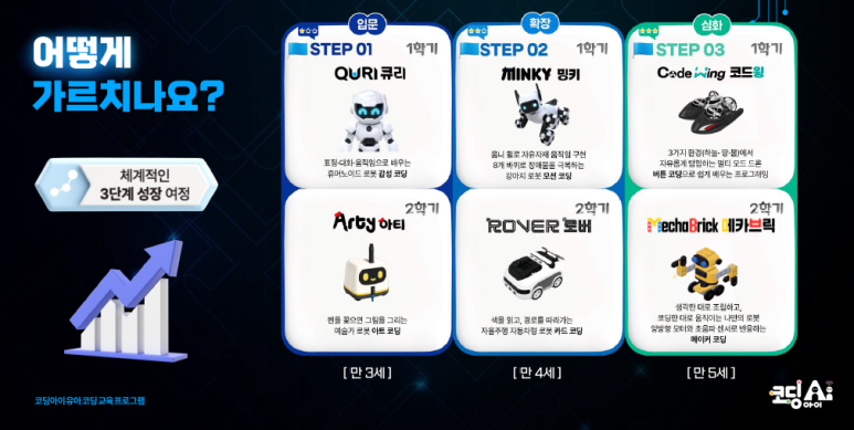 코딩아이는 만 3세 입문(스텝1), 만 4세 확장(스텝2), 만 5세 심화(스텝3)로 구성된다. 각 단계마다 감성 로봇, 모션 로봇, 메이커 로봇 등 교구 6종이 학기별로 새롭게 투입돼, 한 해 동안 아이들이 서로 다른 로봇과 만나며 점진적으로 코딩 개념을 확장하도록 설계됐다. 모든 교구는 ‘1인 1교구’ 원칙에 따라 수업 후 가정으로 가져갈 수 있어 가정 연계 학습도 가능하다.
