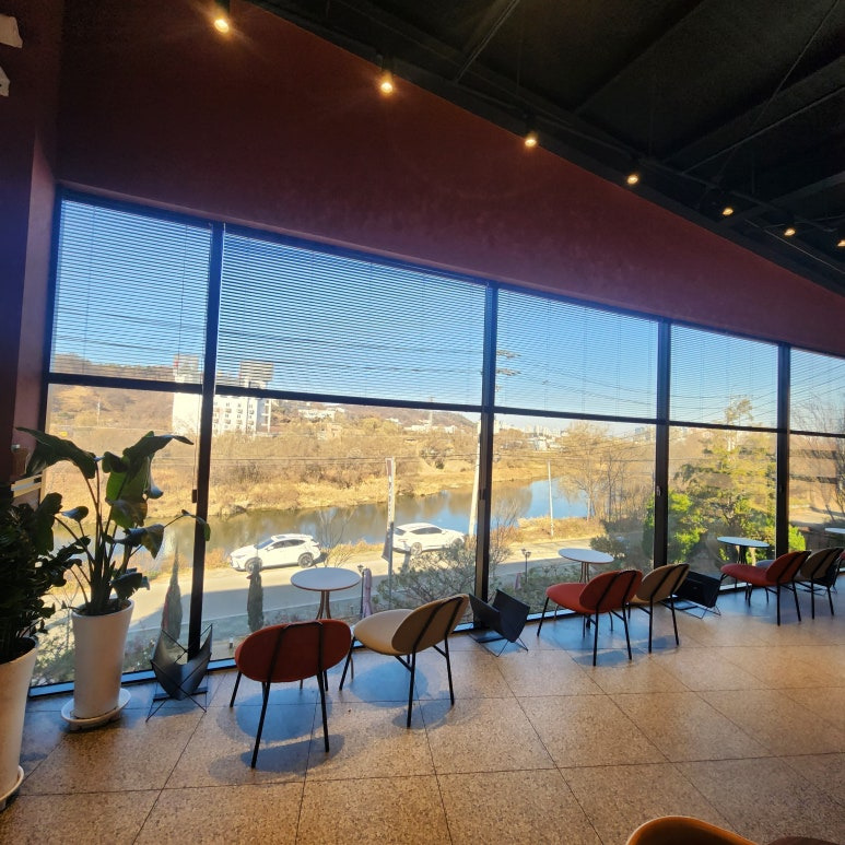 규모부터 남달라요. 1층은 탁 트인 통유리창에 오산천이 훤히 보이고, 야외 테이블까지 있어서 날씨 좋은 날은 진짜 힐링 제대로.