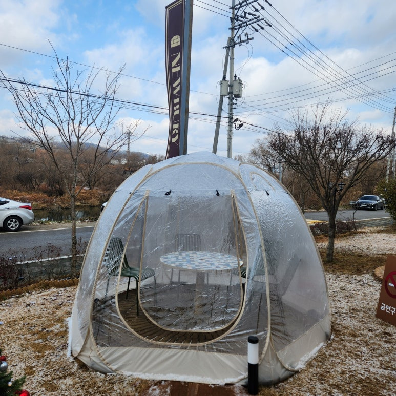 겨울이라 추울까 봤는데, 보온을 위해 투명 텐트가 설치되어 있어서 따뜻하게 앉아 있을 수 있었어요.