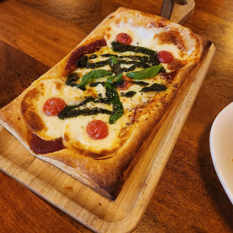 크로아상처럼 버터 향이 은은하게 나고 바삭하면서도 부드러워서 기존 피자와는 차원이 다른 맛이었어요.