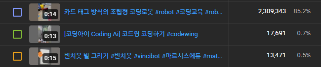 - 콘텐츠 내용: 압도적인 조회수로 1위를 차지한 주인공은 바로 '카드 태그 방식의 조립형 코딩로봇' 영상입니다. 아이들도 쉽게 따라 할 수 있는 직관적인 카드 태그 코딩 방식이 시청자분들의 눈길을 사로잡으며 무려 230만 뷰라는 대기록을 세웠습니다.