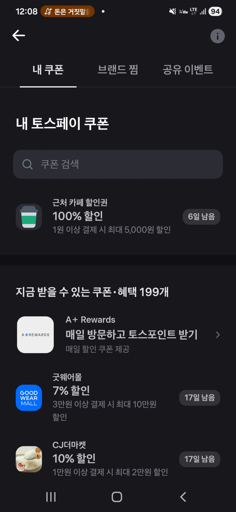 - ‘내 토스페이 쿠폰’ 리스트 중에서 커피 할인권 선택