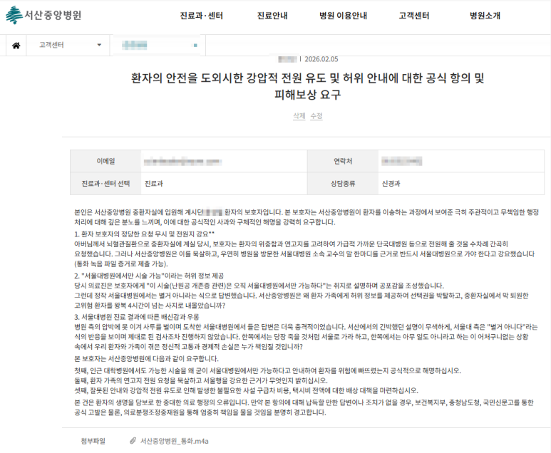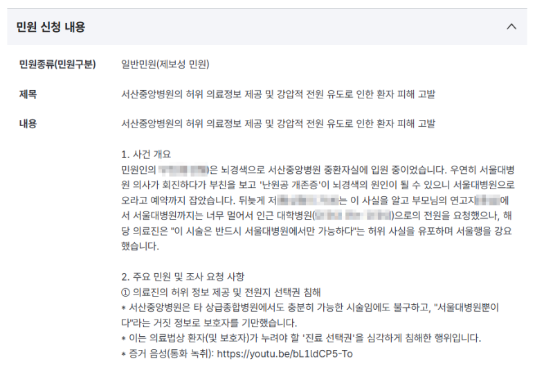 #서산중앙병원 #서울대병원 #의료민원 #환자방치 #진료거부 #뇌경색 #전원병원 #의료행정 #국민신문고