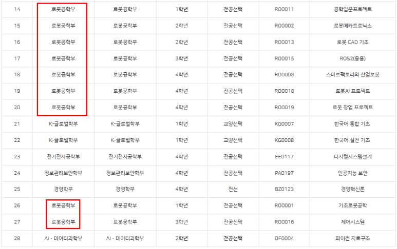 로봇공학과가 신규 개설 학과라서, 아직 대부분의 과목이 미개설 상태라는 답변이 돌아왔습니다.