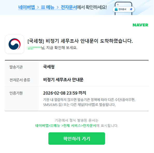 정상적인 국세청 전자고지는 홈택스나 공식 메일 시스템을 통해 오고, 네이버가 중간에 관여하지 않습니다.