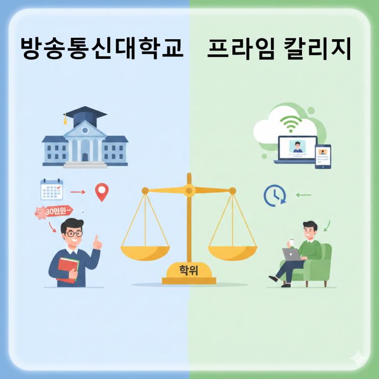 요즘 많은 분들이 “학사학위를 취득하고 싶지만 시간과 비용이 부담스럽다”며 상담을 주시는데요. 그중 가장 많이 비교되는 두 과정이 바로 한국방송통신대학교(방통대 본 과정)와 프라임칼리지입니다.