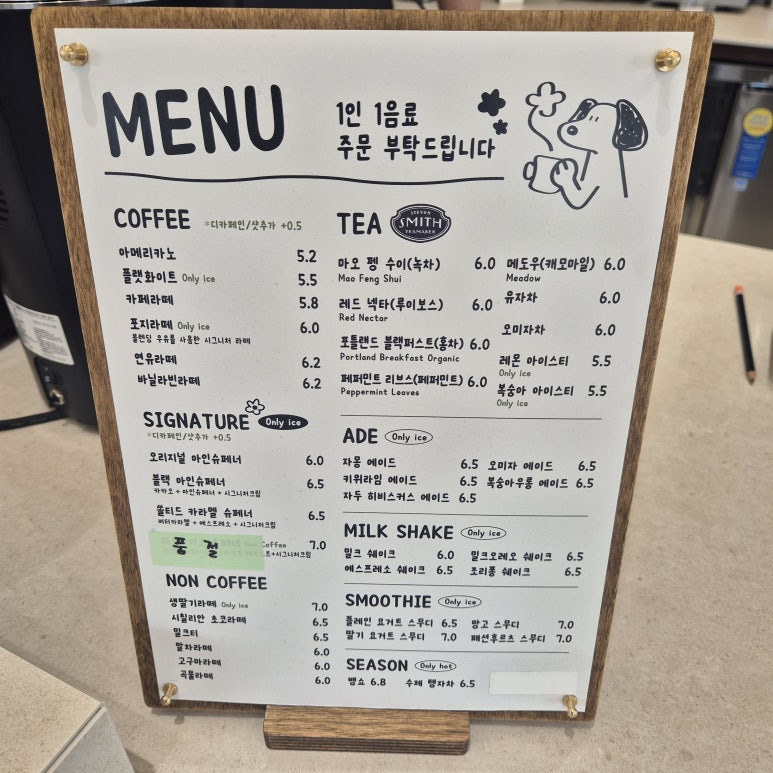 커피는 기본 아메리카노 5,200원(디카페인 +500원), 맛은 보통 이상으로 안정적이었어요.