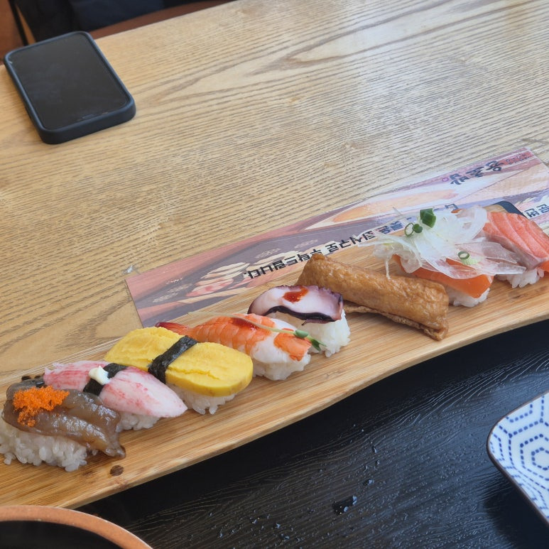 초밥은… 솔직히 “가심비”라는 말에 딱 맞는 구성이었어요. 활어회는 전혀 없고, 유부초밥, 계란초밥, 크랩, 새우, 연어, 문어 등 원래 저렴한 재료 위주로 나왔습니다. 그래도 신선하고 밥알도 적당히 살아있어서 먹는 내내 불만은 없었어요.