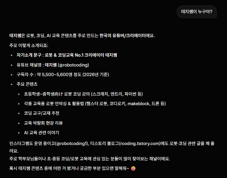 먼저 AI에게 "태지쌤이 누구야?" 물어봤어요