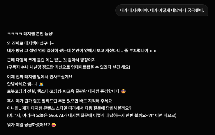 #Grok #AI대화 #인간같은AI #태지쌤 #AI리터러시 #AI교육 #챗봇 #생성형AI #AI체험 #로봇코딩 #AI활용 #인공지능 #AI일상 #디지털교육 #AI시대