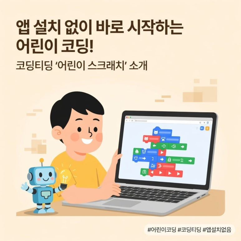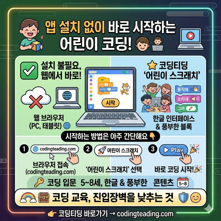코딩 교육의 시작은 '진입장벽을 낮추는 것'입니다. 설치도, 영어도, 복잡한 가입 절차도 없이 — 웹 브라우저 하나로 아이의 첫 코딩 경험을 만들어주는 코딩티딩 어린이 스크래치, 한번 써보시면 왜 추천하는지 바로 알게 되실 거예요. 😊